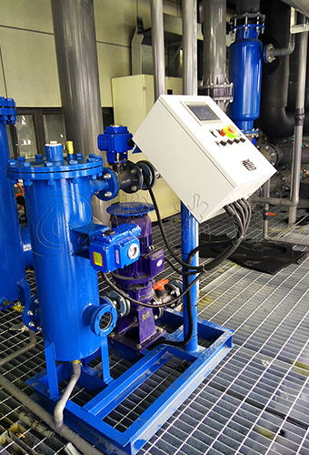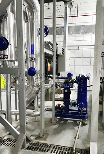 冷凝器膠球清洗裝置是一種在制冷機(jī)組運(yùn)行時(shí),使?jié)駪B(tài)直徑略大于凝汽器換熱管內(nèi)徑的彈性膠球在凝汽器換熱管內(nèi)通過(guò),通過(guò)對(duì)彈性橡膠球體的噴注和回收,實(shí)時(shí)周期清洗換熱管道。在此過(guò)程中膠球擦洗換熱管內(nèi)壁,通過(guò)物理的辦法自動(dòng)在線清洗冷凝器換熱管內(nèi)壁,從而起到了清洗水管內(nèi)壁沉積的污物和水垢,避免微生物的生長(zhǎng),防止腐蝕的作用,確保了換熱管內(nèi)壁清潔,保證了良好的換熱效果,提高了機(jī)組的熱效率。